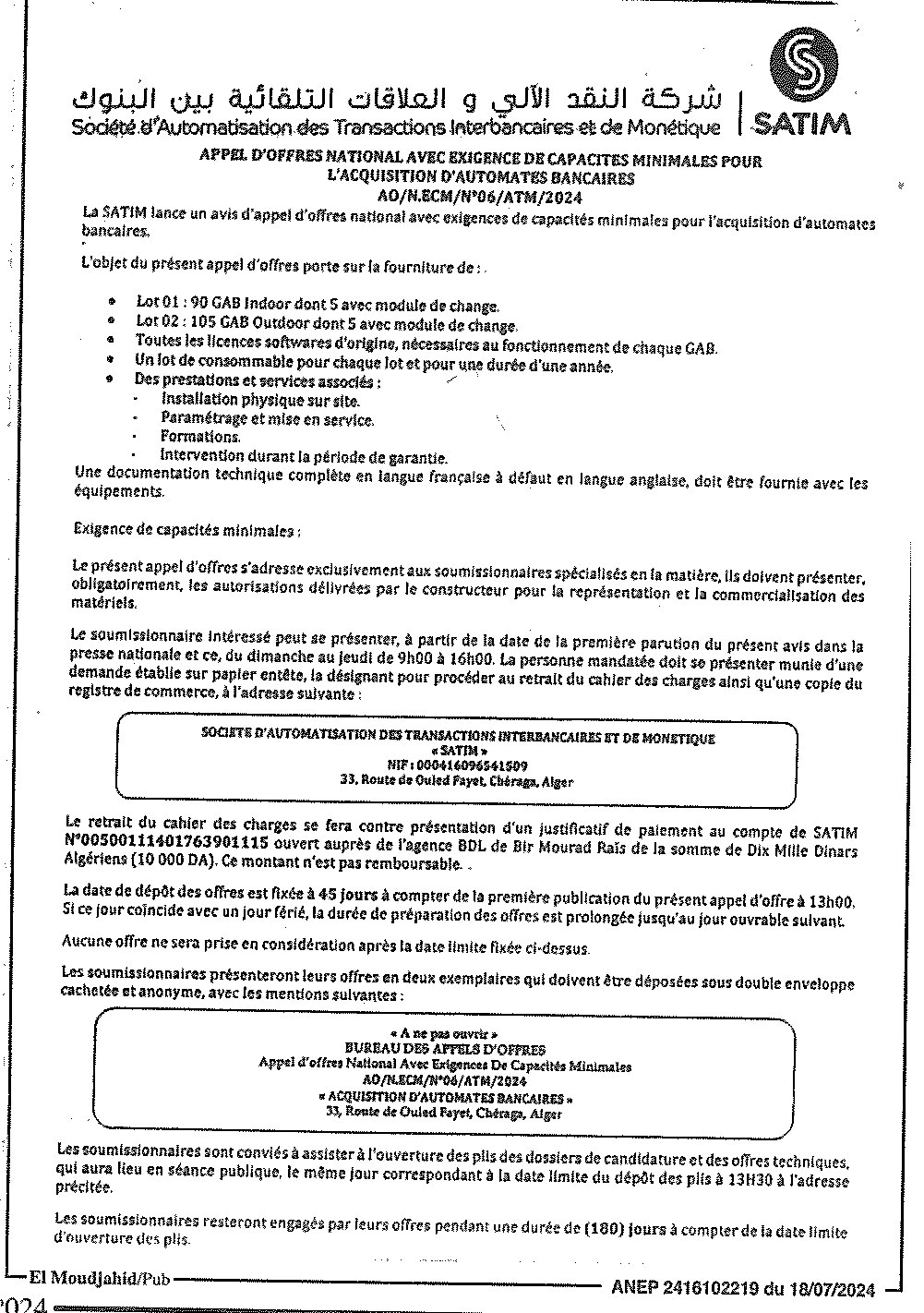 Acquisition d’automates bancaires
